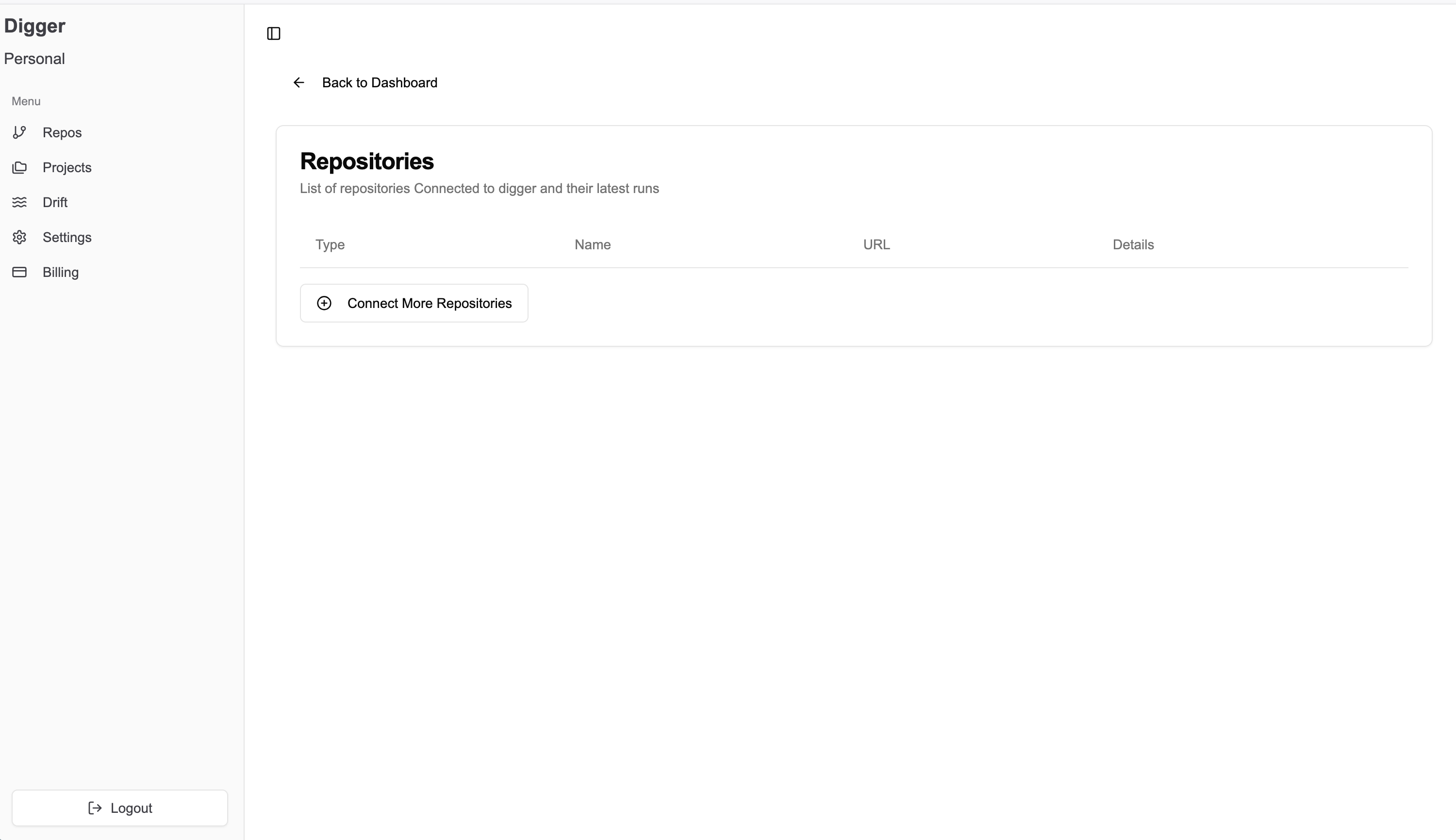 Head to ui.digger.dev and sign up using your preferred method.Post sign up, your dashboard should look like this: